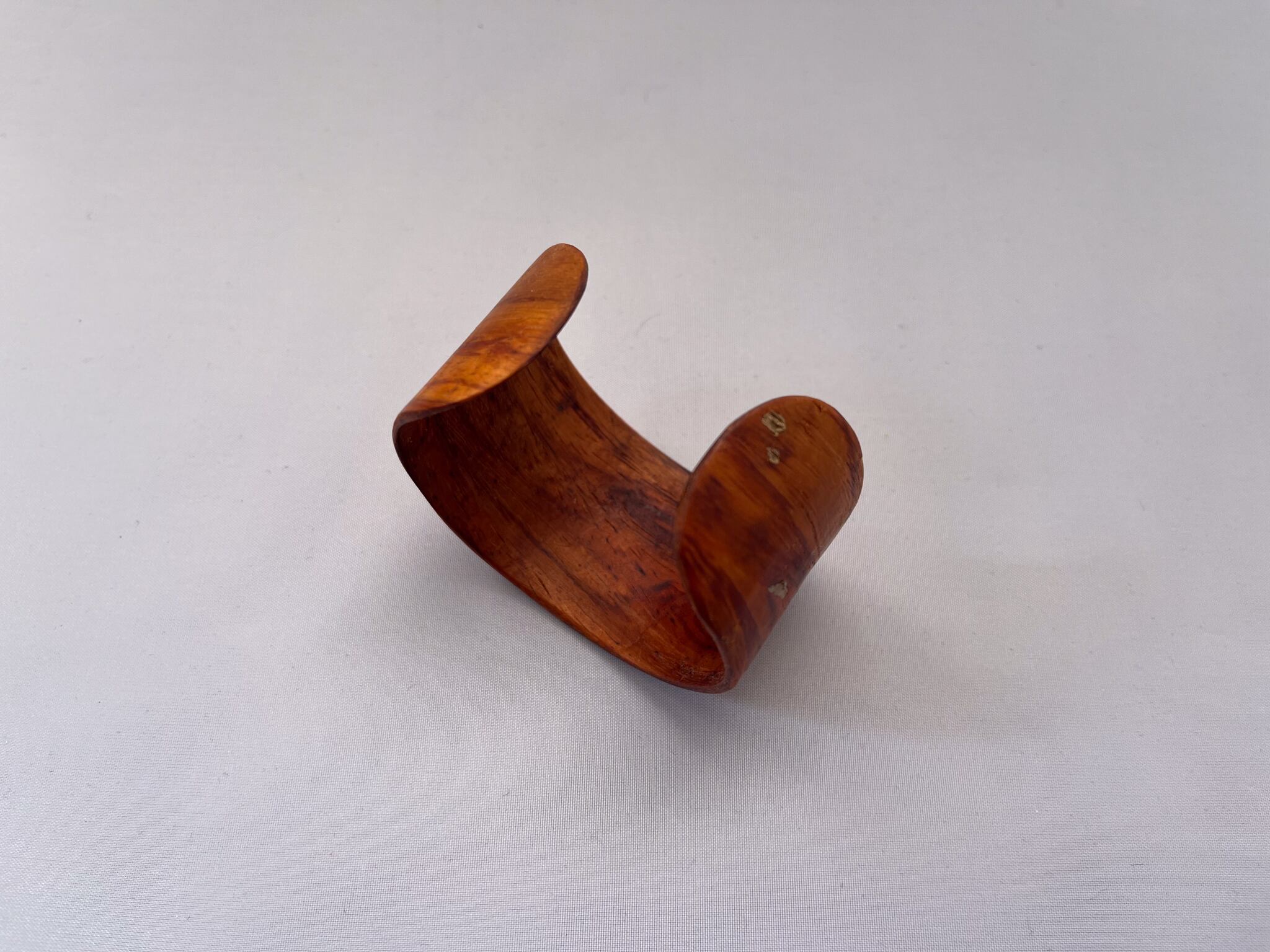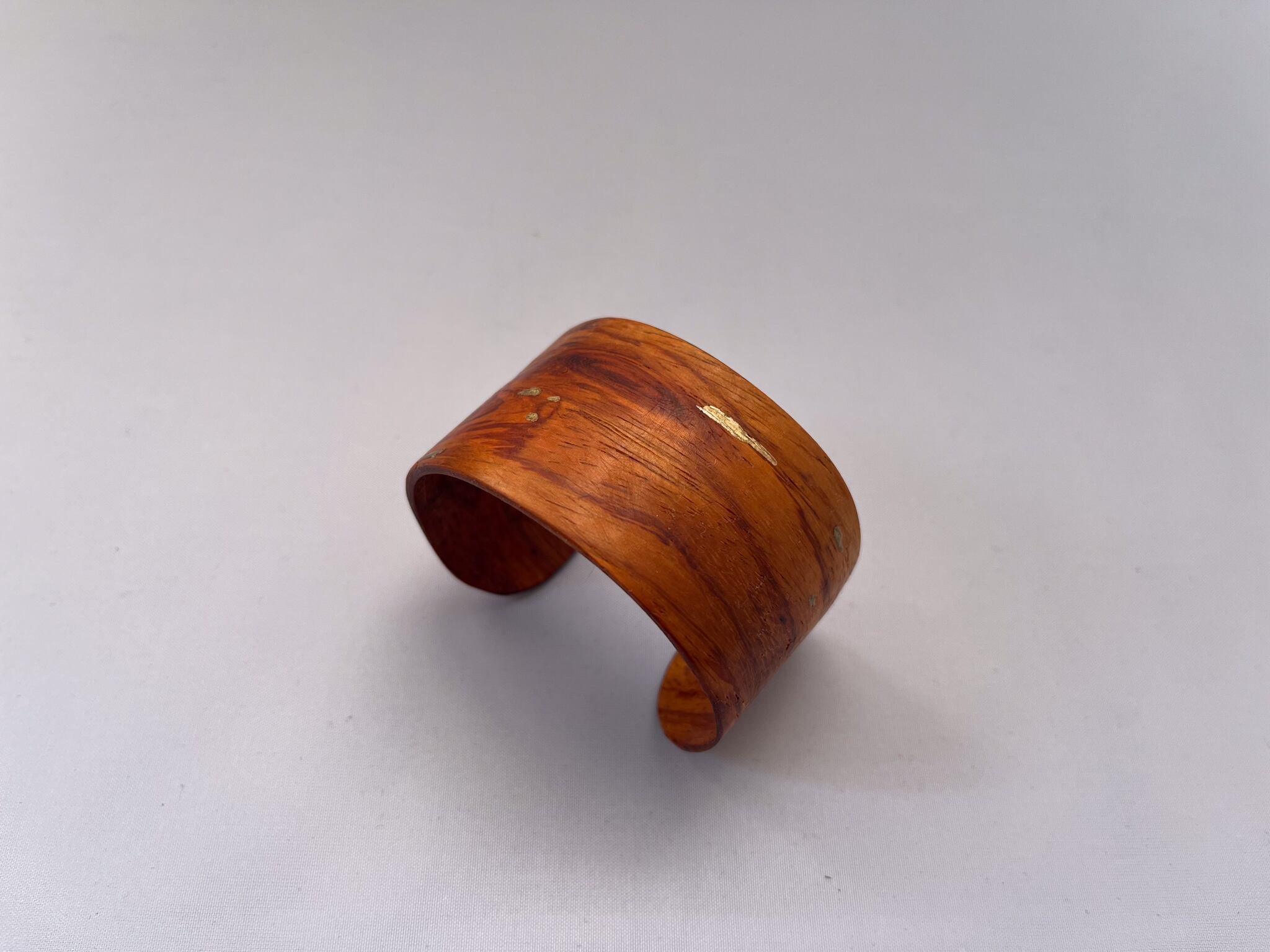 天然のウッド素材を使用し一つ一つ手で曲げて製作したバングル。節、虎斑(トラフ)、オーガニックな変色、木の成長過程でできた傷、木など、個性がある木を使い、その個性を強調するように金継ぎの加工をしています。手首が空く夏のスタイリングにおすすめです◎