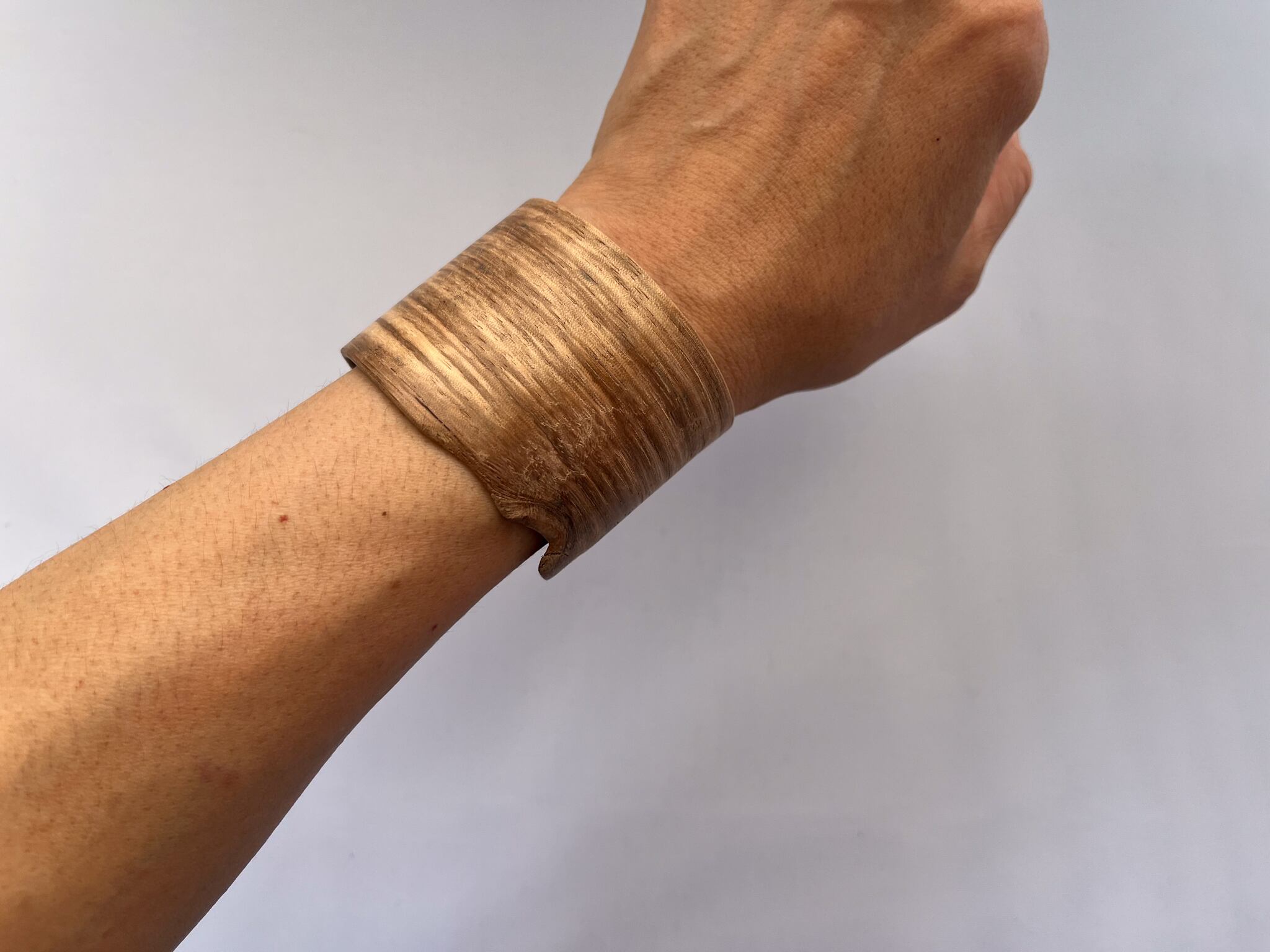 天然のウッド素材を使用し一つ一つ手で曲げて製作したバングル。節、虎斑(トラフ)、オーガニックな変色、木の成長過程でできた傷、木など、個性がある木を使い、その個性を強調するように金継ぎの加工をしています。手首が空く夏のスタイリングにおすすめです◎